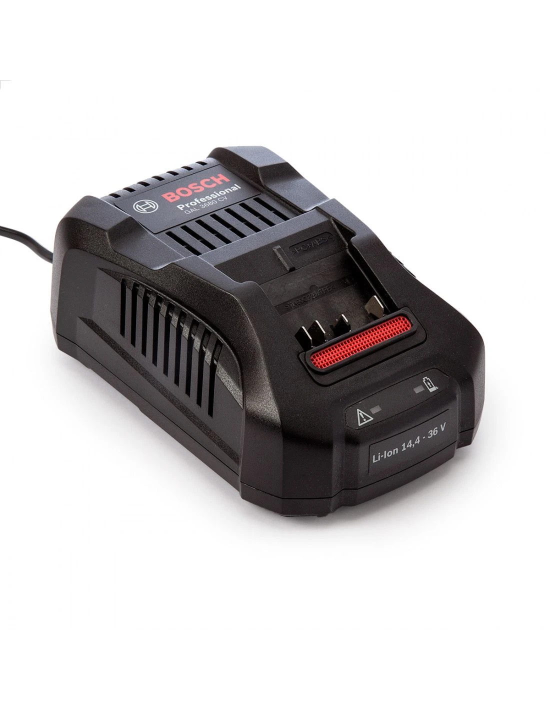 Le chargeur BOSCH GAL3680CV est compatible avec les batteries Bosch « bleu », pro, coulissantes, de 14,4V à 36V, Li-Ion.