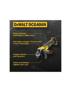 La meuleuse d’angle DeWALT DCG406N est un modèle sans fil de 18V dotée de la dernière génération de moteur brushless (sans charbon) alimenté par une batterie DeWALT XR Li-Ion.
